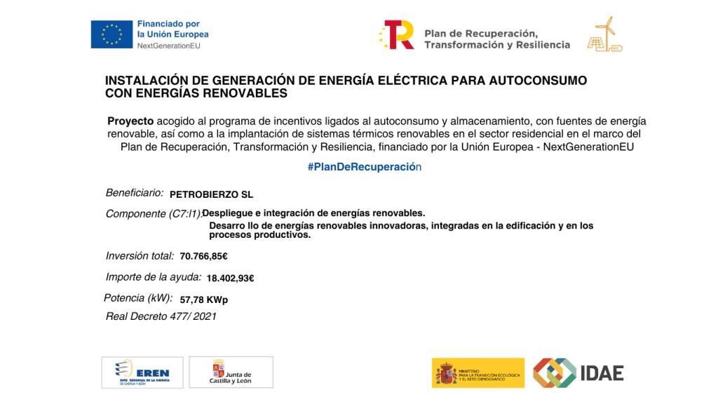 “En Nruta Ponferrada estamos comprometidos con el medio ambiente, por lo que en el 2023 hemos instalado Paneles Solares Fotovoltaicos en nuestras instalaciones, proyecto acogido al programa de incentivos ligados al autoconsumo y almacenamiento, con fuentes de energía renovable, financiado por la Unión Europea con cargo al Fondo NextGenerationEU, en el marco del Plan de Recuperación, Transformación y Resiliencia, en colaboración con el ministerio para la Transición Ecológica y el Reto demográfico, a través del IDAE.”